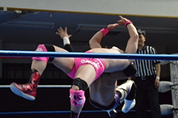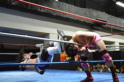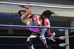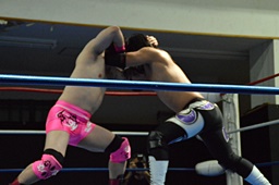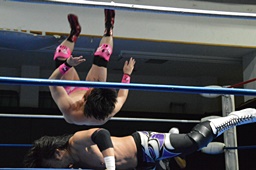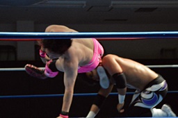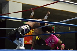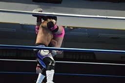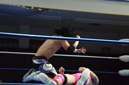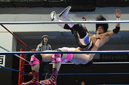 石井ロープに振ってヒップトスからサマーソルトドロップ、佐々木かわす(右写真)。