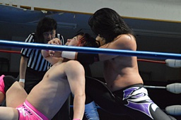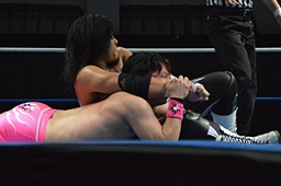 河津落としからグラウンド卍固めに(左写真)、石井なんとかロープ。