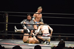 大石と平田ハイタッチ、大石は平田をヒップトス、そこに赤井がニードロップ(右写真)、カウント2。