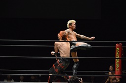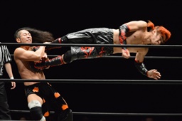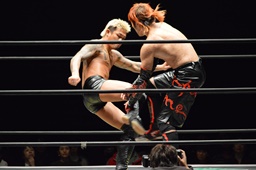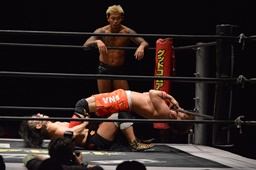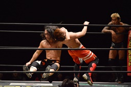 イサミボディスラムからコーナーに上ってダイビングダブルニードロップ、坂口かわしてジャンピングミドルキック(右写真)、高梨にタッチ。