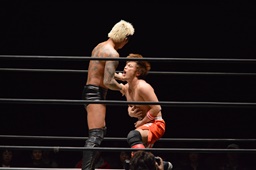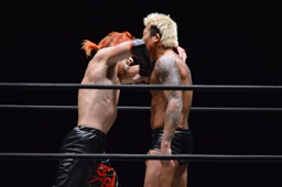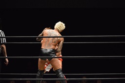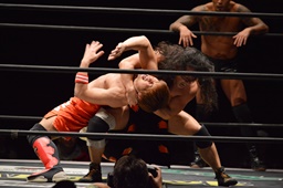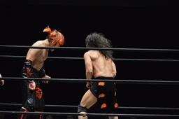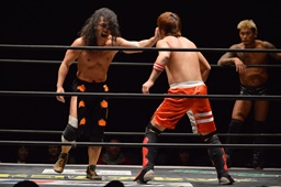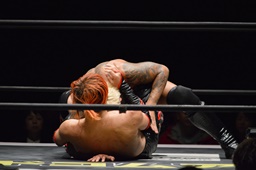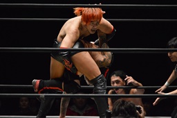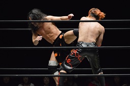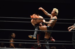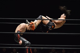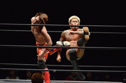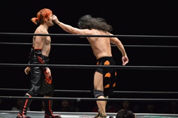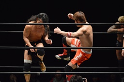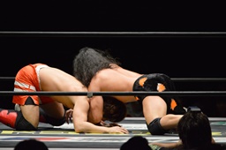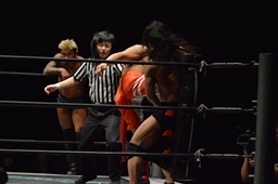高梨両足取るとシーソーホイップの要領で中津のノドをサードロープにぶつける(右写真)、カウント2。高梨は坂口にタッチ。坂口はイサミを呼び込む。中津イサミにタッチ。