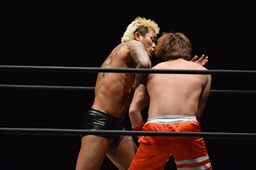 イサミ組み付く、坂口また投げ捨てる(右写真)。