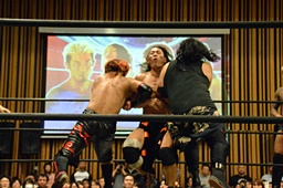BASARA勢が先制攻撃、イサミが坂口を場外に出す(左写真)。