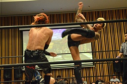 コーナーに振って突っ込む、高梨カウンターのキック、コーナーに上ってミサイルキック(左写真)、坂口にタッチ。