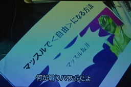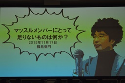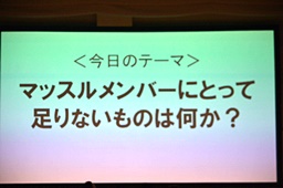 まさかの亜門パワポ。タイトルは「マッスルメンバーにとって足りないものとは何か?」(左写真)