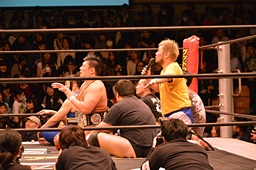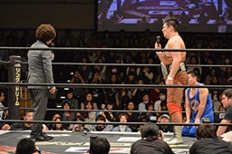 亜門「メインイベントではHARASHIMAと大家が新日本プロレスの棚橋選手、小松選手と激突する。」(左写真)