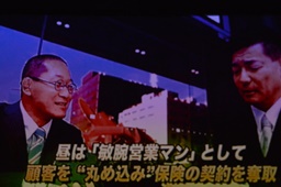 昼は「敏腕営業マン」として顧客を“丸め込み”保険の契約を奪取(左写真)