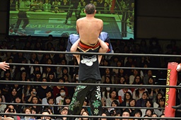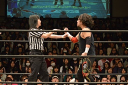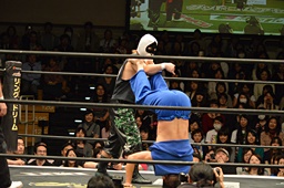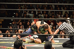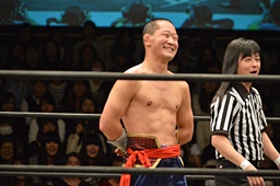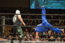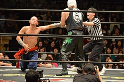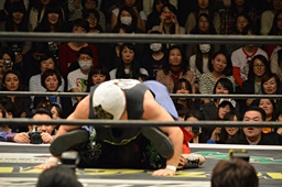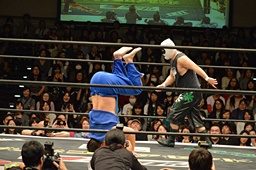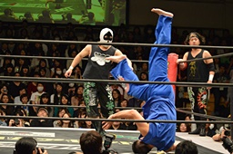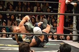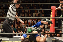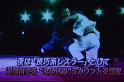 夜は「技巧派レスラー」として対戦相手を“丸め込み”3カウントを奪取(右写真)