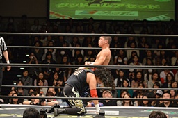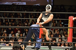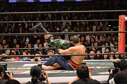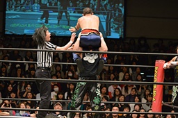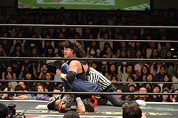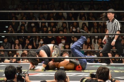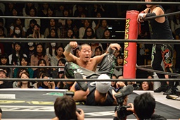 エビ固め(右写真)、カウント2。マジックは久保にタッチ。