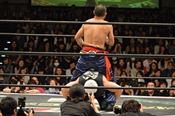抗議するマジックを趙雲はスクールボーイ(左写真)、カウント2。