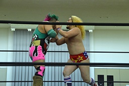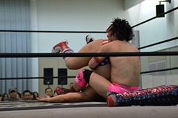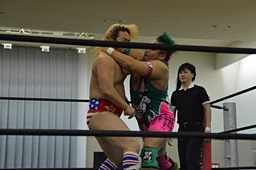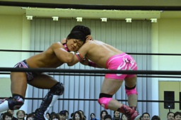 入江と福田ロックアップ、福田がヘッドロック、入江ロープに振ってショルダーブロックの打ち合い(左写真)、