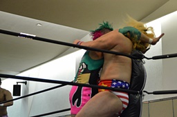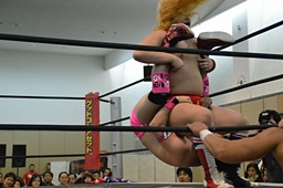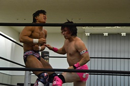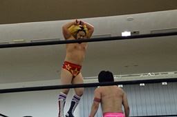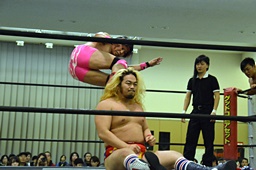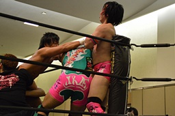 コーナーに振って串刺しラリアット(左写真)、カバーは遠藤がカット。石井が遠藤を場外に出す。