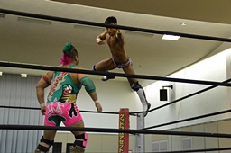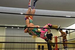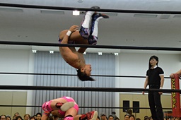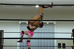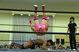 石井ロープに振ってヒップトスからサマーソルトドロップ、遠藤かわす(右写真)、