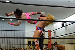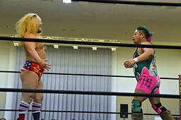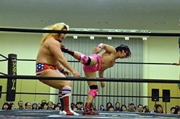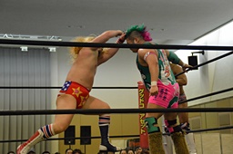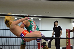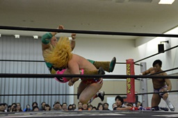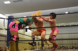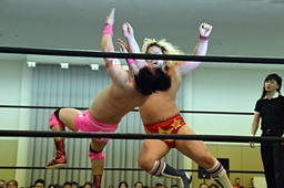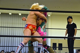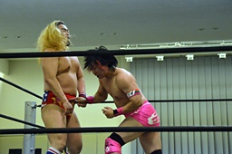 福田ロープに飛ぶ、入江カウンターのショルダーブロック(右写真)、石井にタッチ。石井はコーナーに控えていた遠藤を突き飛ばし、場外でブレーンバスター。