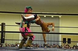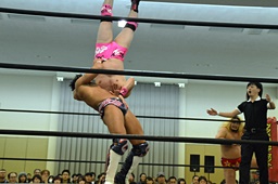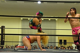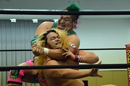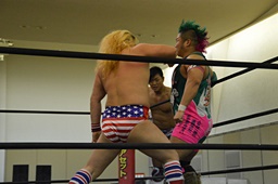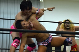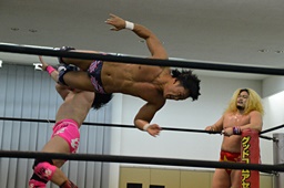 石井首投げから後頭部へのドロップキック(左写真)、カウント2。入江にタッチ。