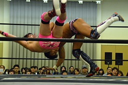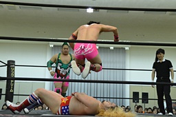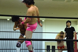 ロープに飛ぶ、入江キャッチしてブラックホールスラム、遠藤ブロック(左写真)、