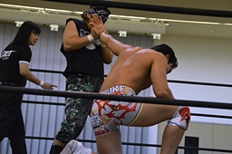 彰人コーナーに引き込んでウラノにタッチ。ウラノパントキック、フェースロック(右写真)、アントンロープ。
