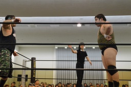 竹下ボディスラム、コーナーに上る、ウラノは木曽レフェリーを引き込む(右写真)。