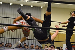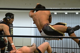彰人が入ってダブルのガットショットからダブルのブレーンバスター狙う(左写真)、