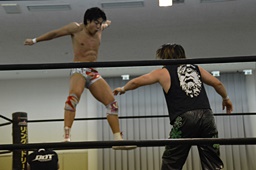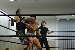 彰人アームブリーカー、アントンをコーナーに詰める、ウラノが捕まえて彰人がガットショット(左写真)。