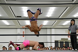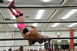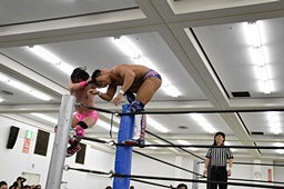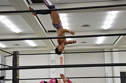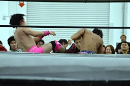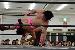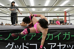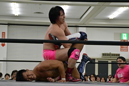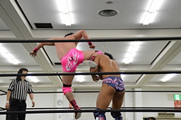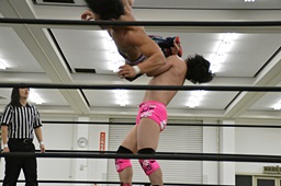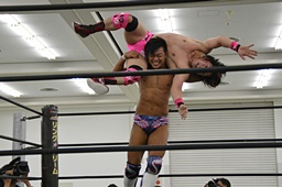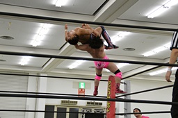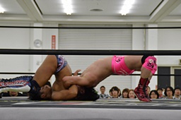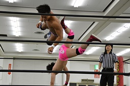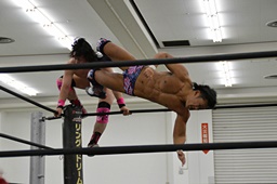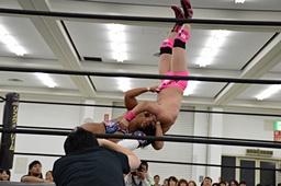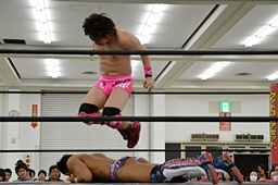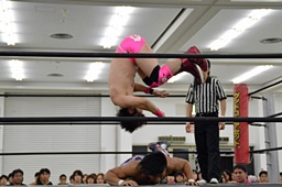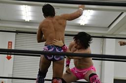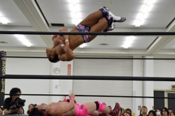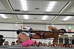石井をリングに戻すとスワンダイブエルボー(右写真)、カウント2。