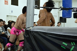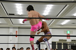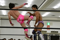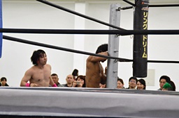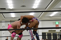 遠藤ボディスラム、コーナーに振る、石井切り返して突っ込む、遠藤ショルダースルー、石井エプロンに着地。石井コーナーに上る、遠藤ドロップキックで場外に落とす(右写真)。