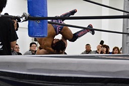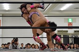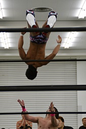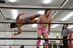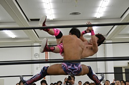ロープワークから遠藤がウラカンホイップ(右写真)、石井場外転落。
