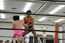 遠藤ロープに振ってヒップトス、ロープに飛んでドロップキック(左写真)。