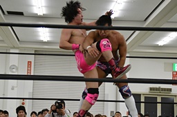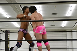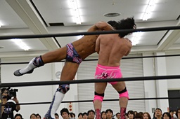 遠藤フランケンシュタイナー(左写真)、カウント2。