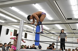 遠藤ボディスラム、コーナーに上る、石井も上る(左写真)、