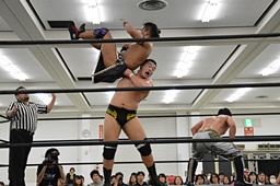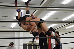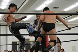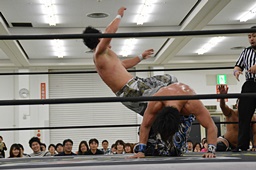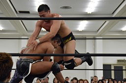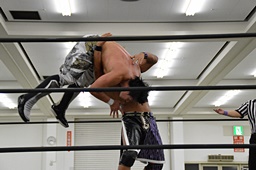 彰人バック取る、樋口切り返してマットに叩きつける(右写真)。残り試合時間1分。