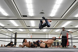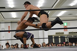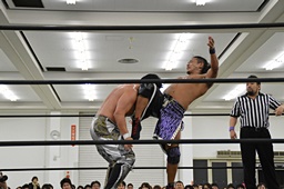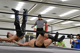 ファルコンアロー(右写真)、カバーは中嶋がカット。彰人が中嶋を場外に出す。