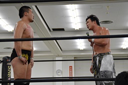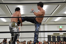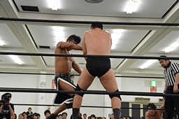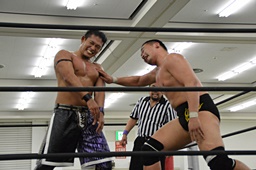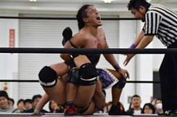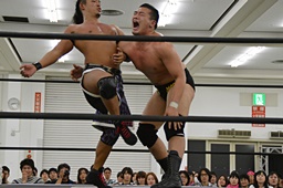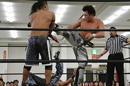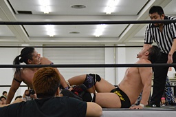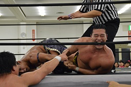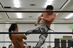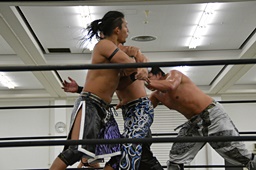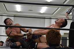HARASHIMAリバースフランケンシュタイナー、樋口途中で止め(左写真)、