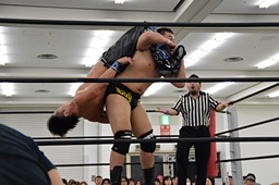 樋口カナディアンバックブリーカー狙う、彰人逆に持ち上げて(右写真)、