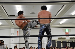 ランニングローキック(右写真)、エプロンのHARASHIMAにビッグブーツ。
