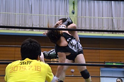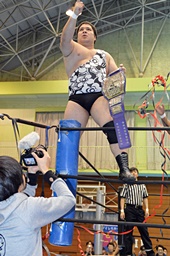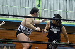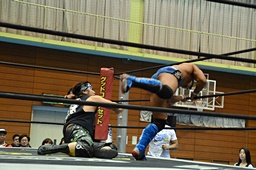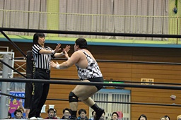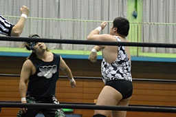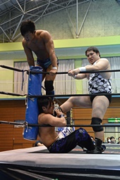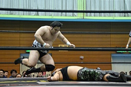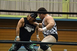 ウラノは遠藤を場外に放り出し(左写真)、HARASHIMAにタッチ。