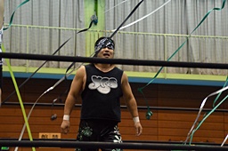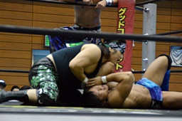 アントン首投げからフェースロック(右写真)、HARASHIMA切り返す。腕に足をねじ込んでバンプ。ウラノにタッチ。