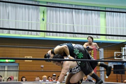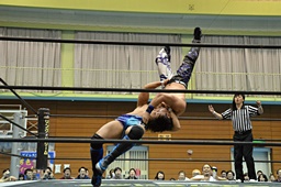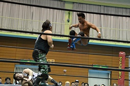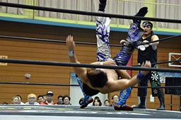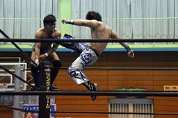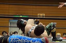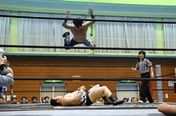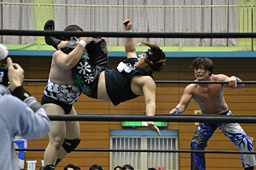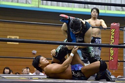 HARASHIMAがスワンダイブプレス(右写真)ウラノがジャックナイフ、カウント2。