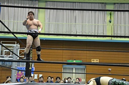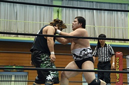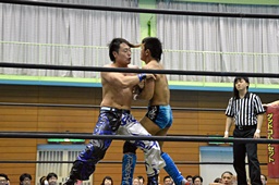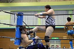 HARASHIMAロープに振ってショルダーブロックの打ち合い(左写真)。HARASHIMAカニばさみで倒しストンピング、遠藤起き上がるとアントンにタッチ。