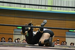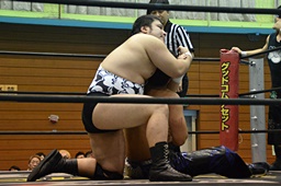 ウラノロケットパンチで動きとめてDDT(右写真)、カウント2。10分経過。