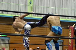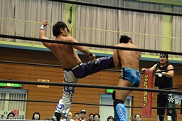 HARASHIMAミドルキック、コーナーに乗せて雪崩式ブレーンバスター狙う、遠藤ブロック。HARASHIMA一旦マットに降りてジャンピングパントキック(右写真)、