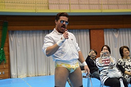 ライアンがマイク取って(もちろん英語で)「私はアメリカから来た有名なプロフェッショナルレスラーだ。男色ディーノ、私はあなたをリスペクトしてる。試合が終わったら我々は友達になれるだろう。だからプレゼントを受け取ってくれ。」(右写真)とキャンディー渡す。