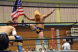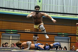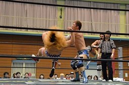 ロープに飛んでショルダーブロック(左写真)、ライアンにタッチ。ディーノも大石にタッチ。