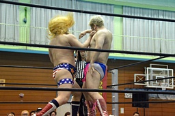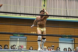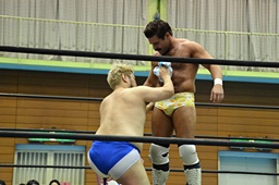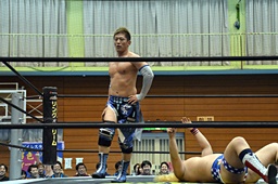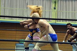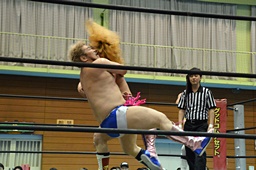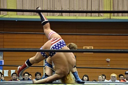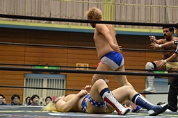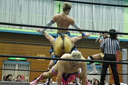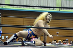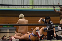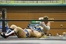 ディーノ福田の顔面に座り込む(右写真)、カウント2。
