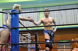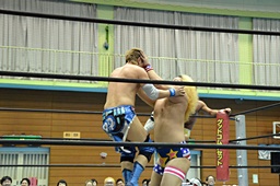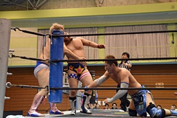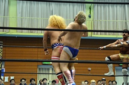 福田ロープに飛ぶ、エプロンからディーノがキャッチ。大石コーナーに戻ってディーノにタッチ(右写真)。