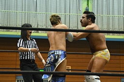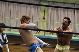 先発は大石と福田。福田ヘッドロック、大石ロープに振る、福田ショルダーブロック。福田ロープに飛ぶ、大石バックエルボー(右写真)。