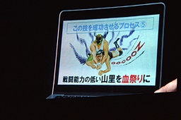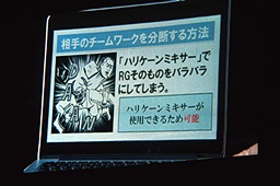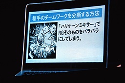 映像部隊の機転により、カメラでPC画面を撮ってビジョンに映す方法を採用。素晴らしい。プレゼンのタイトルは「1vs2のハンディキャップマッチで効率的に勝つ方法」(右写真)。
