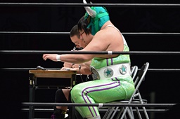 この技を成功させるプロセスAセコンドの渡瀬瑞基がRGを羽交い締めに。(左写真)