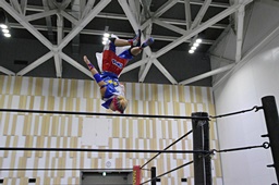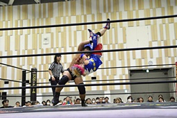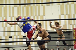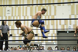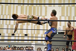 勝俣ロープに飛ぶが高木はカウンターのフライングクロスアタック(右写真)から619。