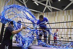 地元の英雄・大石真翔が紙テープをまとめる(右写真)。